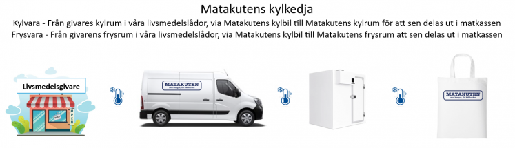Kylkedjan innebär att vi har rutiner som säkerställer att kyl- och frysvaror hanteras på rätt sätt från att vi hämtar gåvorna hos givaren, under transporten till lokalen samt under hanteringen i lokalen.